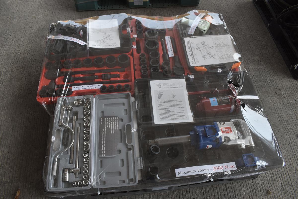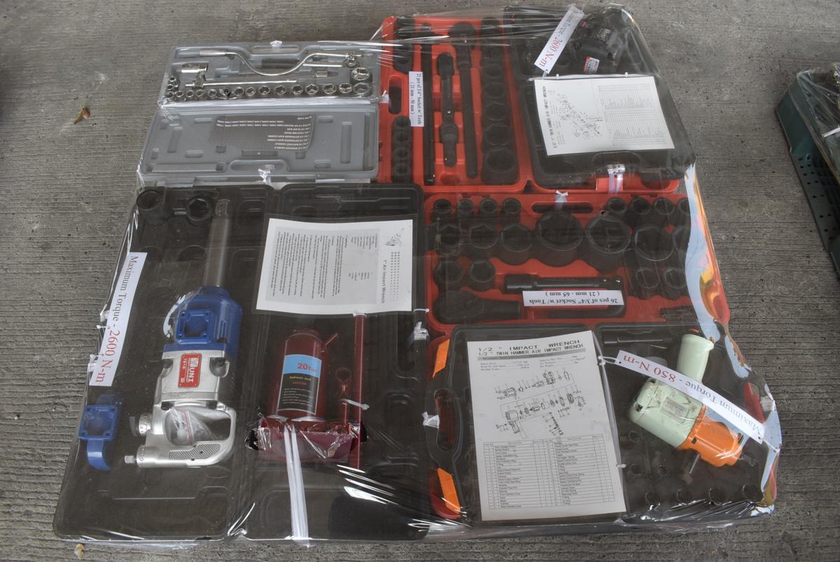 - - 7 PCS UNUSED YUNI AIR IMPACT WRENCH, SOCKET SET & 20T BOTTLE JACK